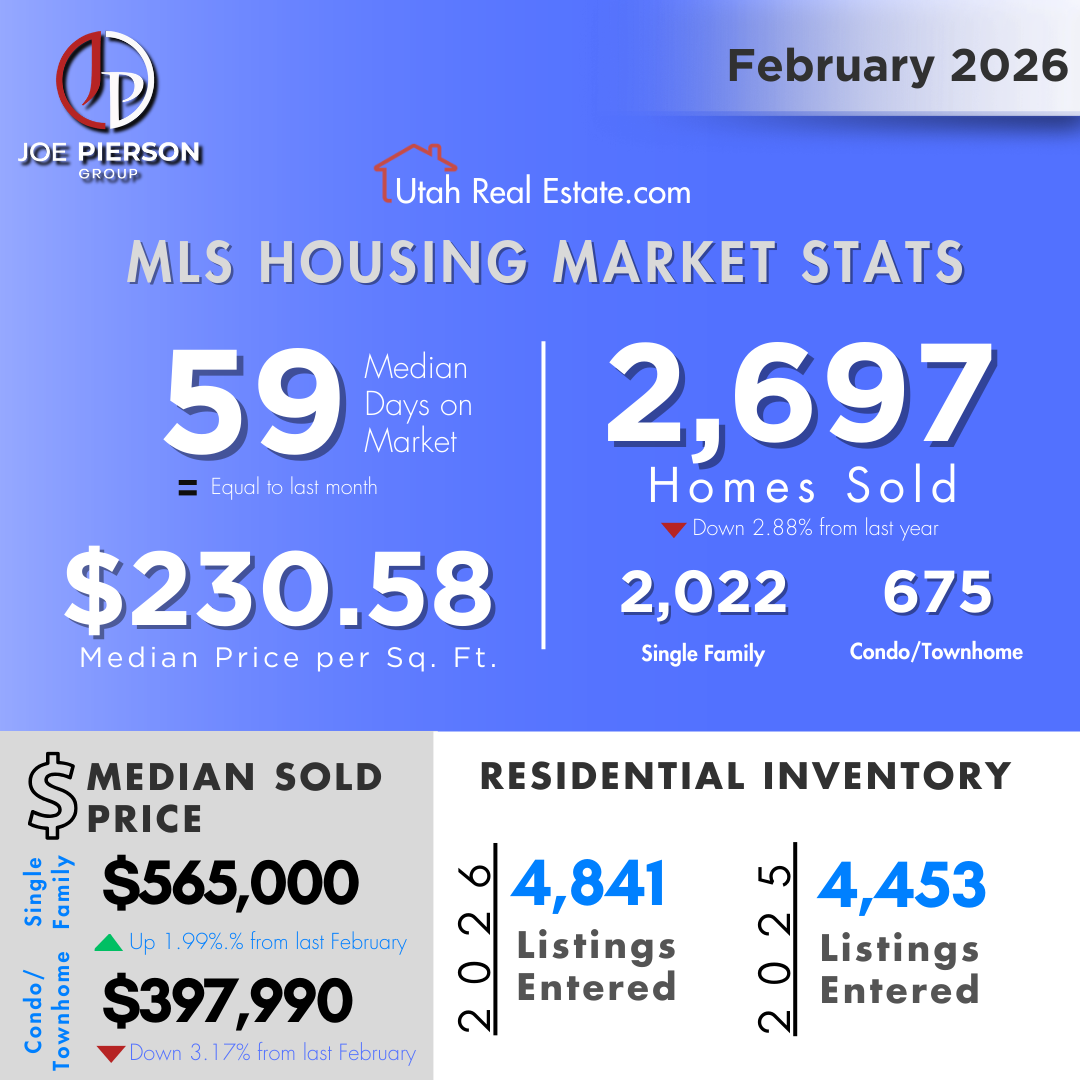 The February 2026 housing market shows slightly lower sales, stable time on market, and modest price growth in single-family homes. Inventory is increasing, which is helping move the market toward a more balanced environment between buyers and sellers.